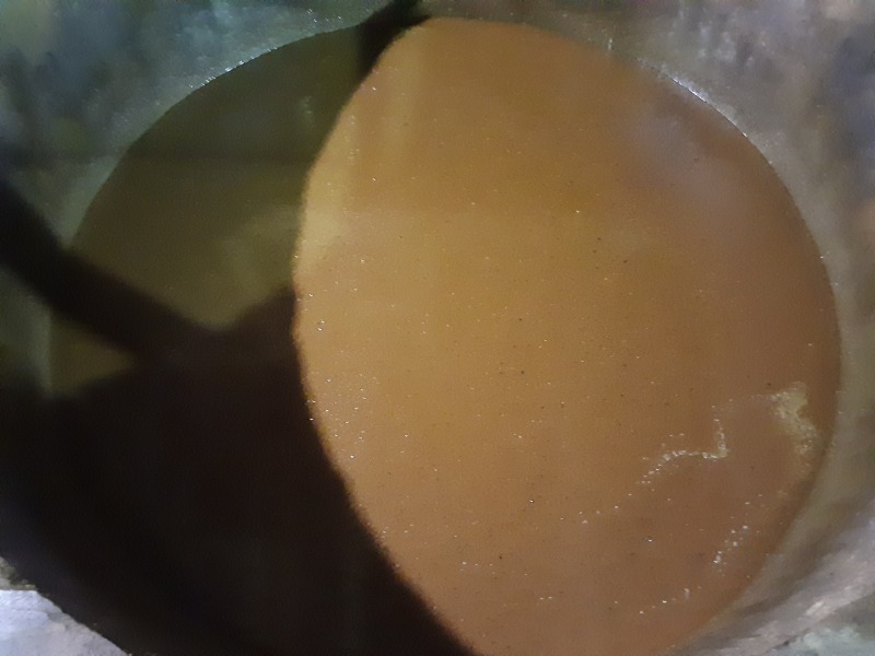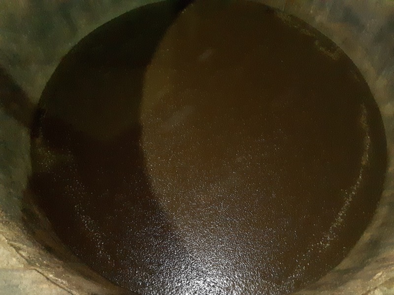 まだ仕込んで1年経っていない若いモロミですので、攪拌前のモロミの色はこげ茶色です。