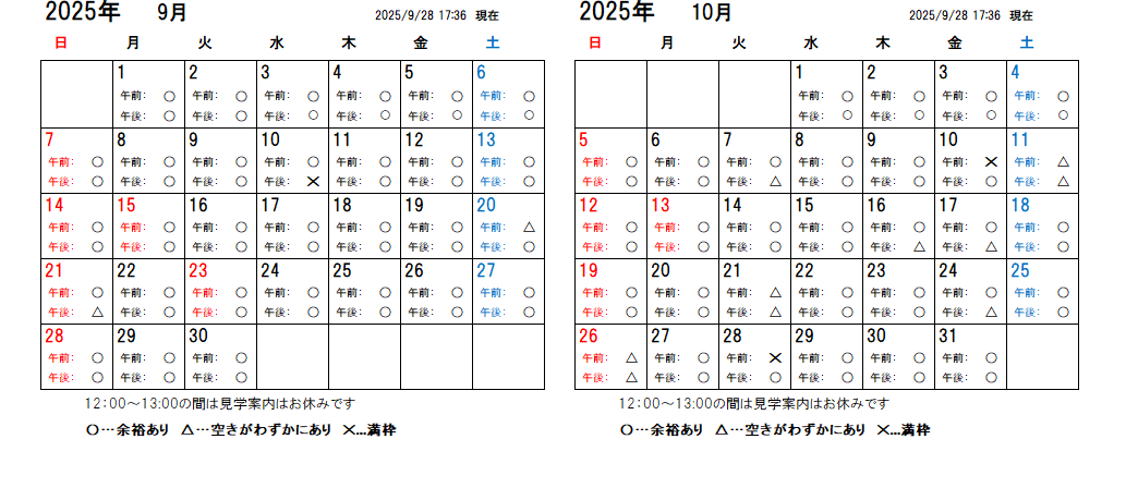 【2025年9月更新】大間々工場 仕込蔵見学予約カレンダー