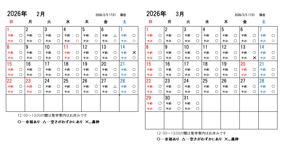 【2026年2月更新】大間々工場 仕込蔵見学予約カレンダー