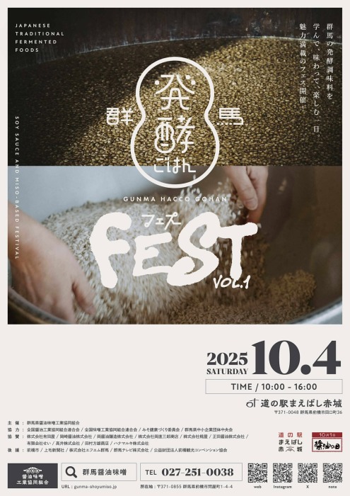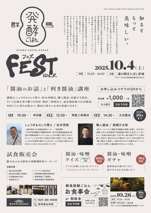 イベント お知らせ 大間々工場だより 【群馬発酵ごはんフェス】に参加します! 2025.09.12 大間々工場スタッフ 日本一しょうゆ 岡直三郎商店 大間々工場のヒワタシです。10月4日(土)に道の駅まえばし赤城にて開催される【群馬発酵ごはんフェス】に、岡直三郎商店も参加いたします! 当日は「醤油のお話」や「利き醤油講座」、協賛各社による発酵調味料の「試食販売会」、「醤油・味噌ガチャ」なんて物も!発酵食品好きの方には見逃せない内容となっております。こちらは【完全予約制】ですので、参加をご希望の方は添付画像を是非チェックしてくださいね。 一覧に戻る