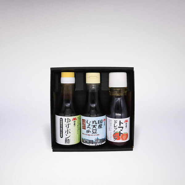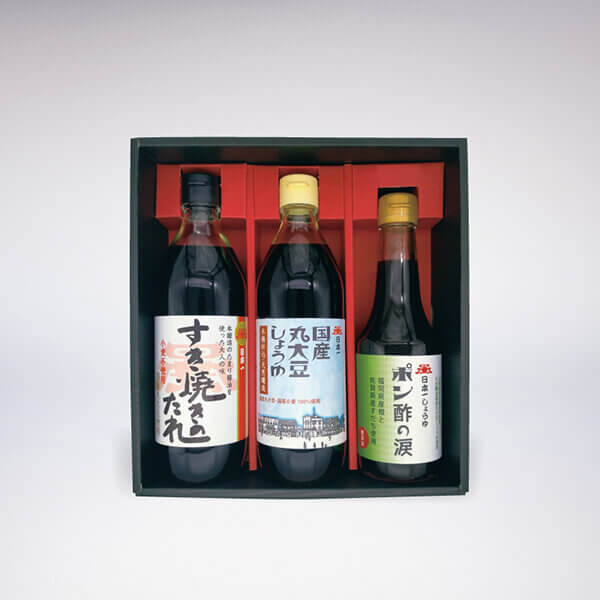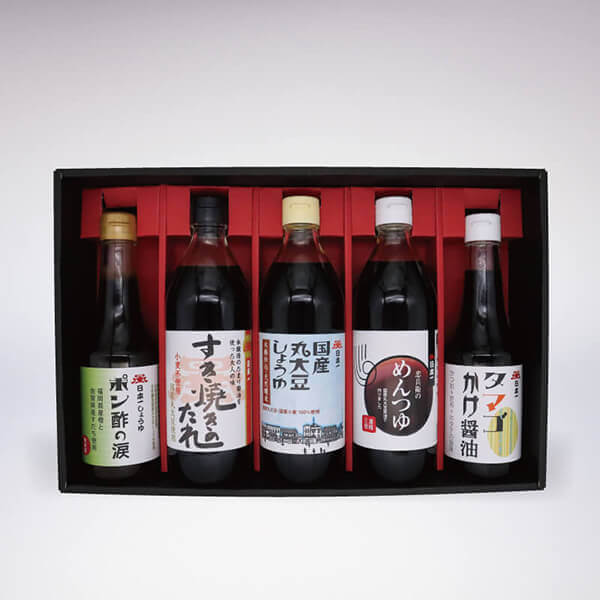 木桶に仕込み、四季の寒暖差で発酵・熟成させた自慢の醤油を。お中元や、お手土産にも是非ご利用くださいませ。