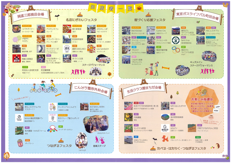 各会場では、キッチンカー、飲食の販売、新鮮野菜の販売、各種物販、ワークショップ等、出店者が集まり、