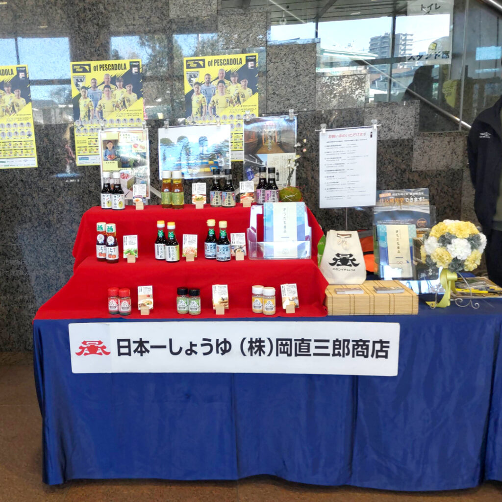 ペスカドーラ町田と弊社のコラボ缶バッジに、「日本一スパイス」のプレゼント、弊社ブースでは商品の紹介させていただきました。