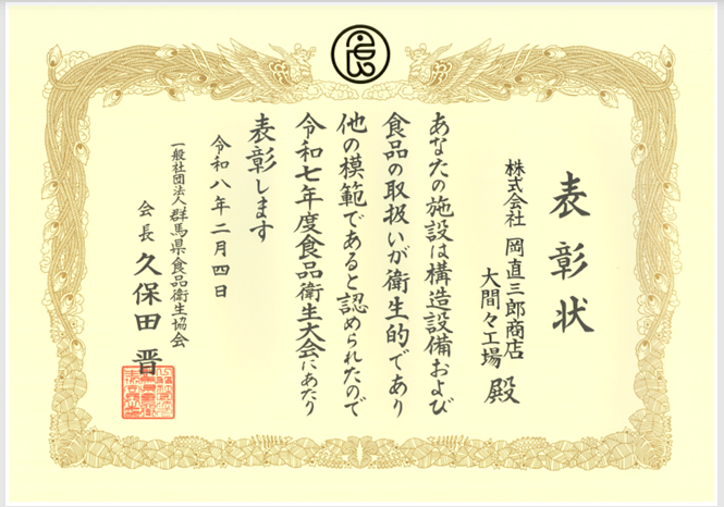 大間々工場だより 【食品衛生優良施設(会長表彰)】に表彰されました! 2026.02.05 大間々工場スタッフ 日本一しょうゆ 岡直三郎商店大間々工場のヤマナカです。この度、令和7年度群馬県食品衛生大会において、大間々工場が「食品衛生優良施設(会長表彰)」として表彰をいただきました。日頃から取り組んできた衛生管理への姿勢をこのような形で評価していただき、身の引き締まる思いです。今回の表彰を励みに、より一層衛生管理に気を引き締めてまいります。 一覧に戻る