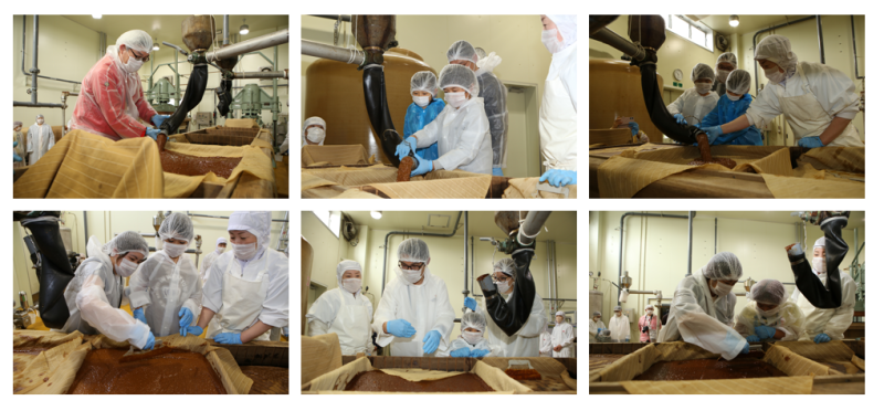 「しぼり体験会」では2025年2月に仕込んだ「諸味(もろみ)」をしぼり、生揚げ醤油を作る作業をしていただきます。