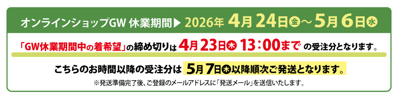 オンラインショップ お知らせ ブログ 大間々工場だより 町田本社だより 【オンラインショップGW休業】のご案内 2026.03.25 町田本社スタッフ 平素は格別のご高配を賜り、誠にありがとうございます。誠に勝手ながら、オンラインショップのGW休業を下記のとおりとさせていただきます。ご理解、ご協力の程よろしくお願いいたします。 混雑が予想されますので、お早目のご注文をお願いいたします。また、ご希望の配達時間にお届けできない場合もございます。予めご了承ください。ご不便をおかけいたしますが、何卒ご了承いただきますよう、お願い申し上げます。 一覧に戻る