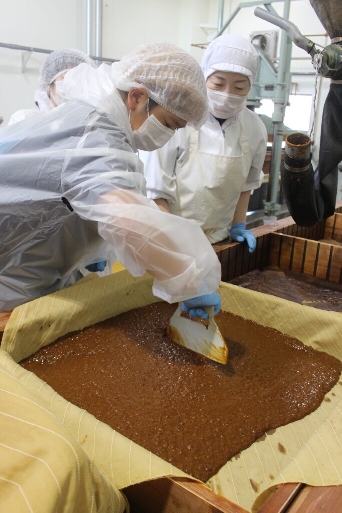 こちらは出した諸味(もろみ)が均等になるように器具を使用して馴らしている所です。とても真剣な表情です。