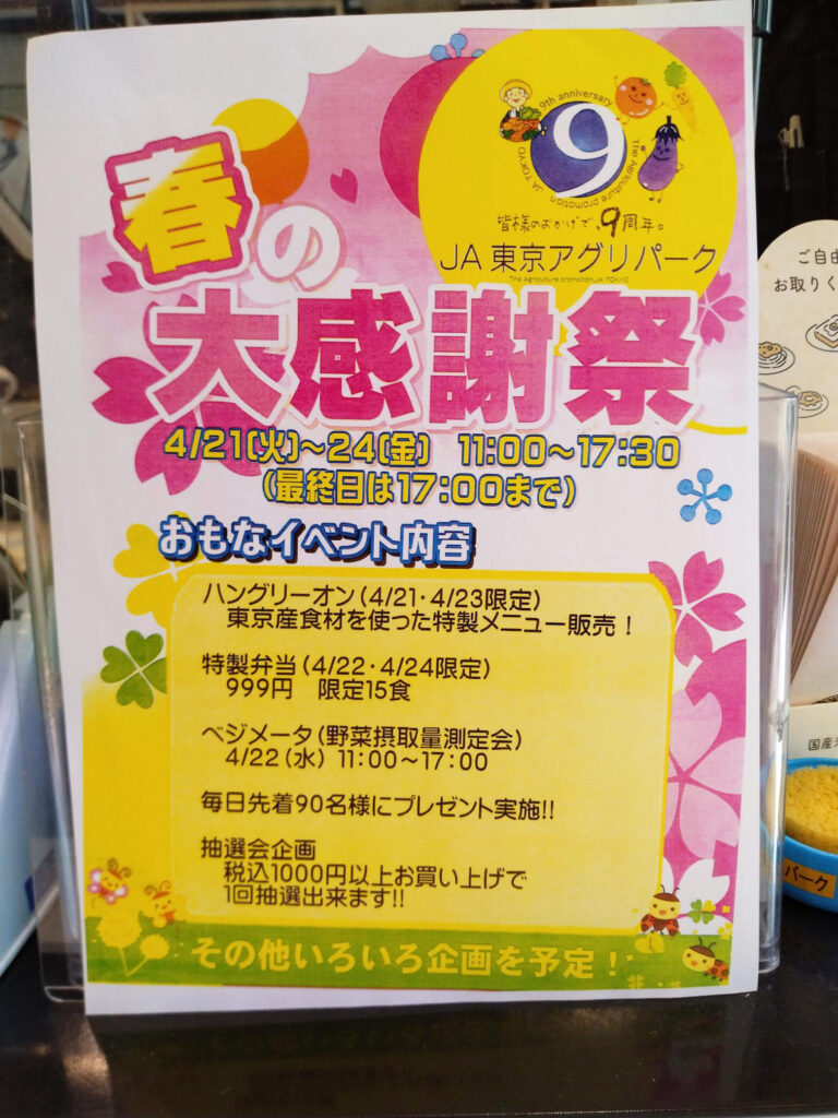 JA東京アグリパークはおかげ様で9周年!JA東京アグリパークは、これからも東京農業、東京産農産物、東京産食材の魅力を消費者のみなさんに広め、東京にこだわったイベントを開催します。ご来場頂いているお客様に感謝の気持ちを込めて、「プレゼント企画」を企画予定!この機会に、皆様のご来店をお待ちしております!